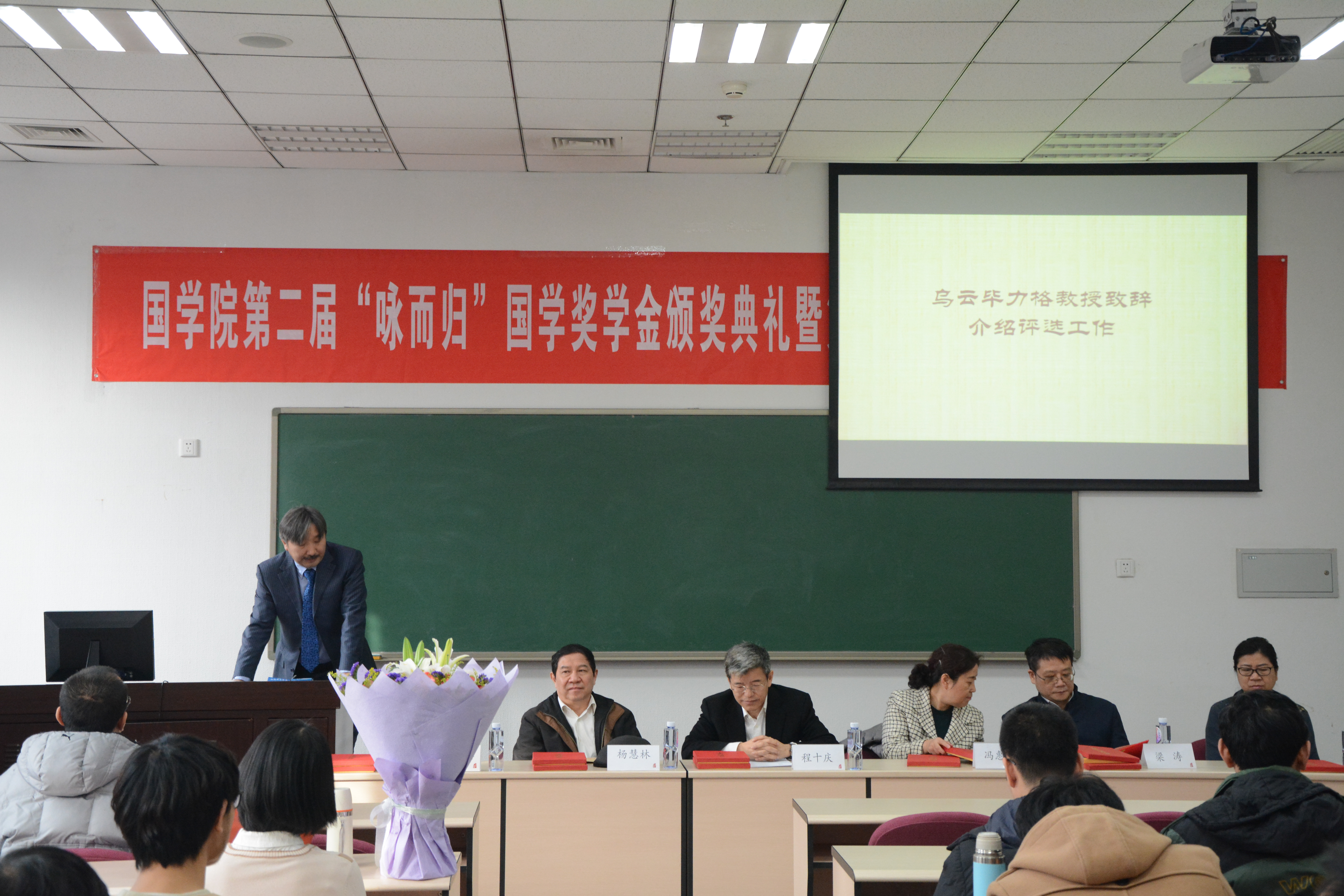 在两位教授发言完毕后,程十庆先生上台致辞。他向获奖学生表示祝贺,说明了自己设立“咏而归”国学奖学金的心路历程,表达了对学校生活的向往之情。他还宣读了获奖学生的名单,他们分别是:本科生李嘉哲、邱文杰、徐星星、秦慧敏;硕士生张含若、何亦凡、李思睿、刘严;博士生萨出日拉图、杨继承、柯昊。发言完毕后,程十庆先生接受了学生代表的献花。