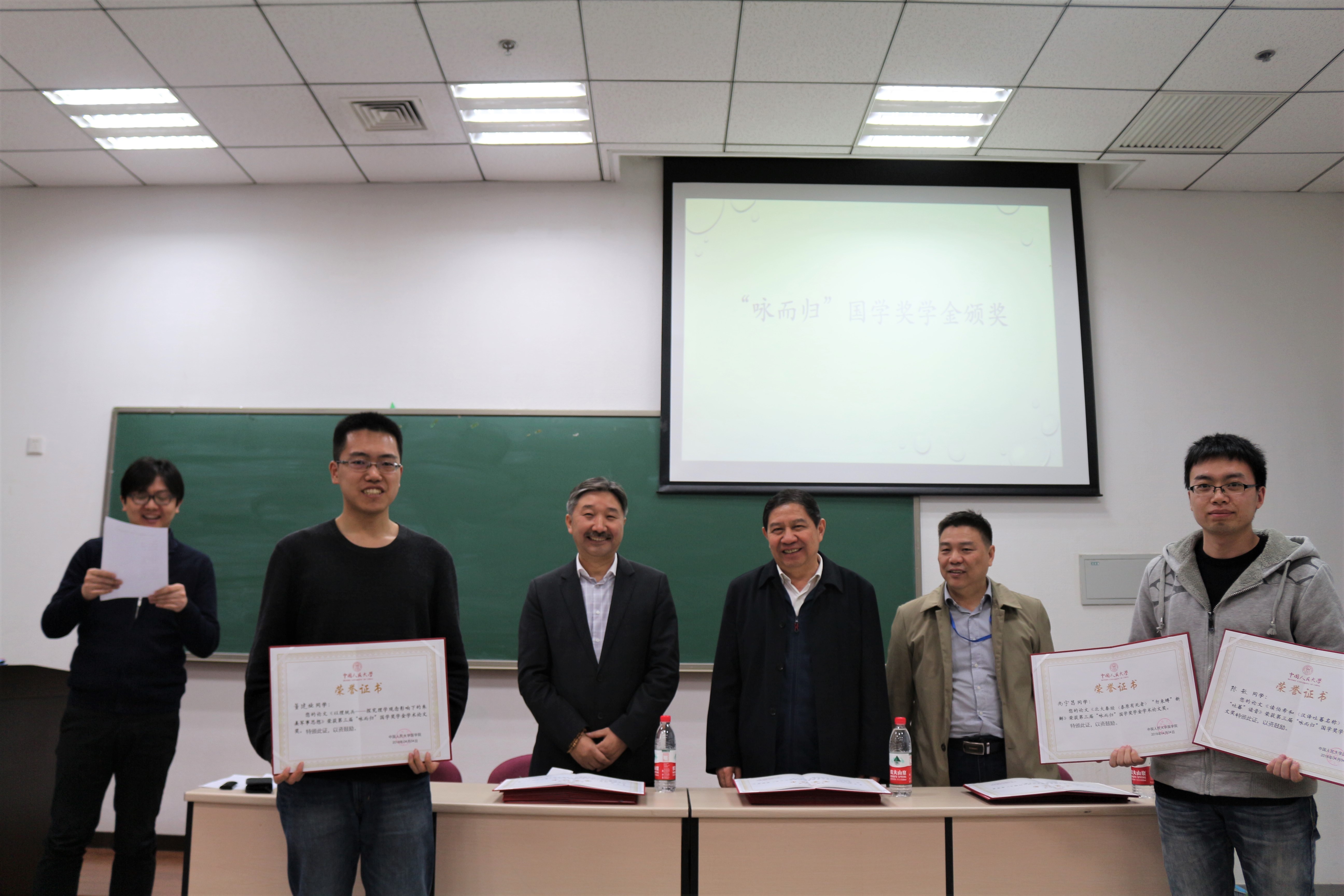 然后,杨慧林教授宣读了第三届“咏而归”国学奖学金的获奖名单,并和乌云毕力格教授、诸葛忆兵教授一起,为同学们颁奖。