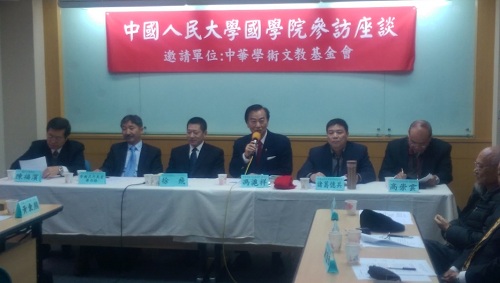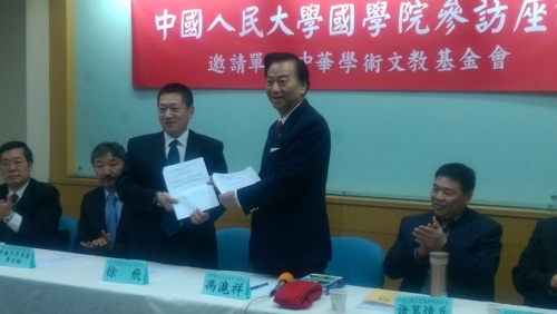 2015年1月7日,禁漫app 党委书记徐飞、副院长乌云毕力格、诸葛忆兵三位领导,应台湾“中华学术文教基金会”邀请赴台,进行为期7天的教育参访。这是两岸第一次针对国学的交流,具有重大的意义。1月8日,双方在台湾台大校友会馆,举办了一场“国学教育交流座谈会”。座谈会由中华学术文教基金会董事长、海峡两岸文教经贸交流协会理事长冯沪祥教授主持,与会者有禁漫app 党委书记兼副院长徐飞副教授、副院长乌云毕力格教授、诸葛忆兵教授,中华学术基金会副董事长高崇云教授、董事陈光宪教授、陈松雄教授、陈德禹教授、黄金文教授、黄东熊教授、欧茵西教授、蔡秋来教授、胡侨荣教授,辅仁大学陈福滨教授、台湾大学杜保瑞教授、钮则诚教授、倪道纪教授等。大家在发言中,一致认为座谈会对于深化两岸国学教育的推广普及具有重要意义。双方就两岸国学教育推广的方法与问题,进行了热烈的讨论。会议最后,基金会董事长与经贸交流协会理事长冯沪祥教授与禁漫app 党书记徐飞教授二人,各自代表双方,签订了两岸第一份民间“国学推广教育”的合作计划,为两岸民间的国学以及文化互动方式,创立了第一份合作协议模式。内容包括人民大学接待台湾大学生参访团、双方共同合办“留学生国学营”、高层互访、合办论坛、相互观摩教学等。此次座谈会及签署的合作协议,在两岸民间文化交流活动中是一个非常重要的范例。
