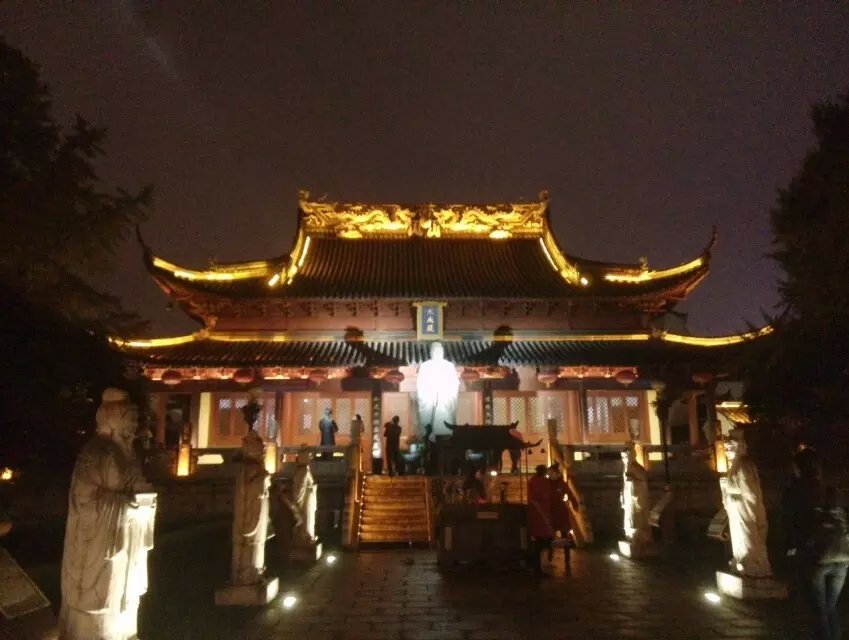 夫子庙大成殿:大成殿是南京夫子庙的主殿,高16.22米,阔28.1米,深21.7米。我们在参观大成殿时,在殿前瞻仰了目前全国最高的孔子白玉雕像。而殿内正中悬挂一幅全国最大的孔子画像,高6.50米、宽3.15米。除此之外,大成殿内四周墙壁镶嵌有《孔子圣迹图》壁画,采用玉石,鸡血冻、寿山石、翡翠及黄金珠宝、罗钿等名品饰件以浮雕镶嵌造型,每幅画高2.5米,宽1.3米,计38幅,内有人物雕像408位,所雕人像及亭台楼阁、人文故事等,栩栩如生,非常传神,表述了孔子“万世师表”的典范形象。光“孔子诞生”这一情节,圣迹图就展现了多种预示的说法,体现孔子“圣人”之特点。虽然其中有些情节在专业角度看来过于夸大,但是也从另一侧面反映了民间对孔子的信仰崇拜。