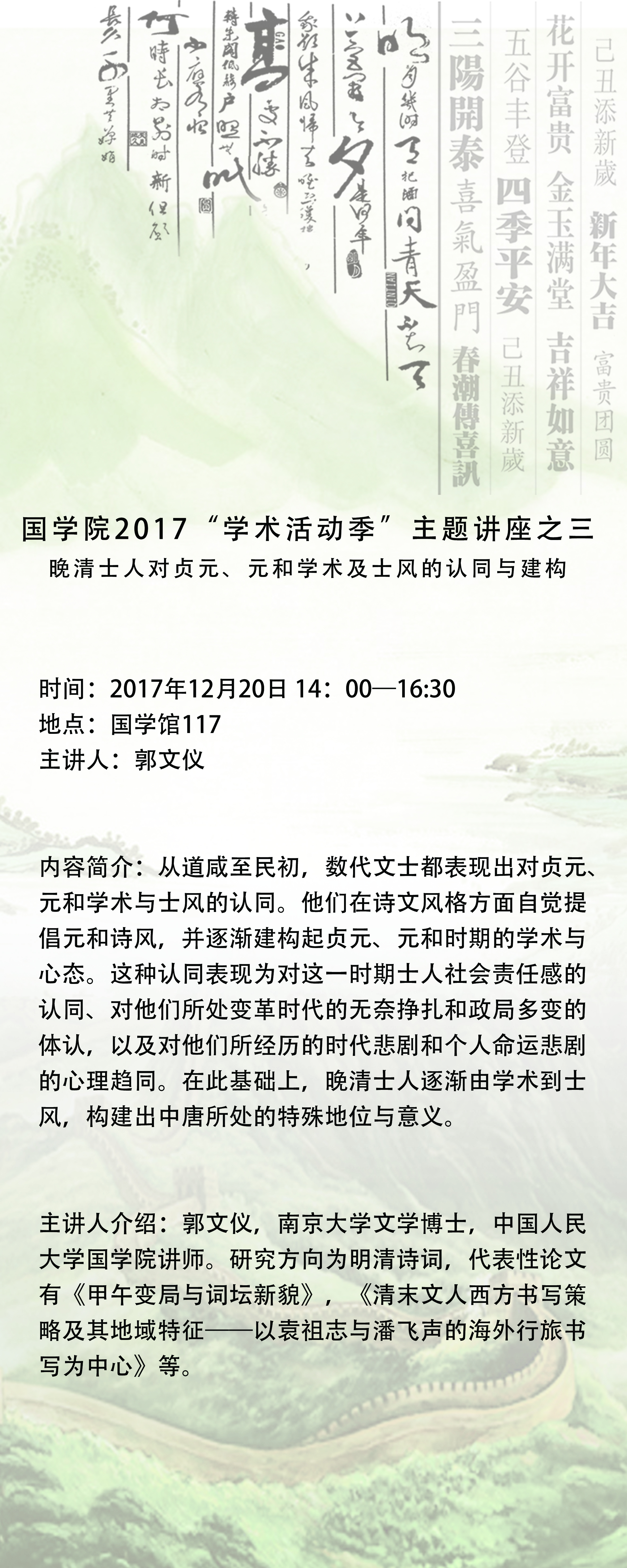 主讲人介绍:郭文仪,南京大学文学博士,禁漫app 讲师。研究方向为明清诗词,代表性论文有《甲午变局与词坛新貌》,《清末文人西方书写策略及其地域特征——以袁祖志与潘飞声的海外行旅书写为中心》等。
