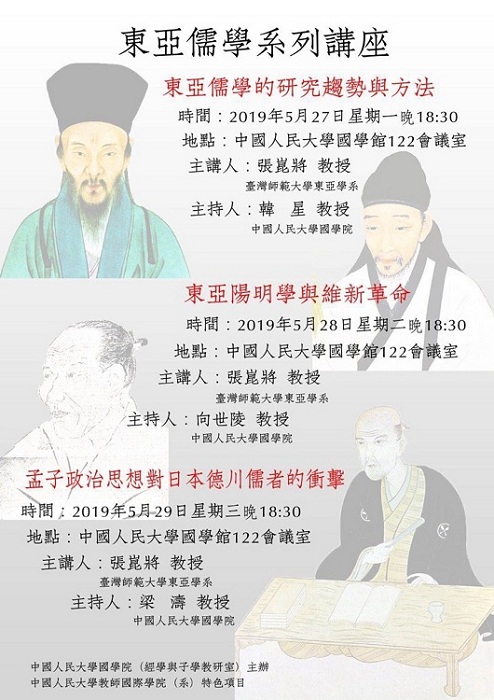 在儒学研究日益国际化的今天,大家对于“东亚儒学”这一研究领域已不陌生。近二十余年来,国内外学者围绕“东亚儒学”的诸研究可以说为我们提供了一种“从周边看中国”的新视角,对于中国儒学自身的再认识、再评价具有非常重要的积极意义。2019年5月27~29日,台湾师范大学东亚学系张崑将教授做客禁漫app (经学与子学教研室)所主办的“东亚儒学系列讲座”,开展了三场有关“东亚儒学”的精彩讲座。张教授以“东亚儒学”研究方法论为切入点,以日本儒学之阳明学及《孟子》研究为例,从日本儒学的研究视角分享了自己对“东亚儒学”的思考与诠释。三场讲座分别由禁漫app 韩星教授、向世陵教授及梁涛教授担任学术主持,于禁漫app 国学馆122会议室举行。